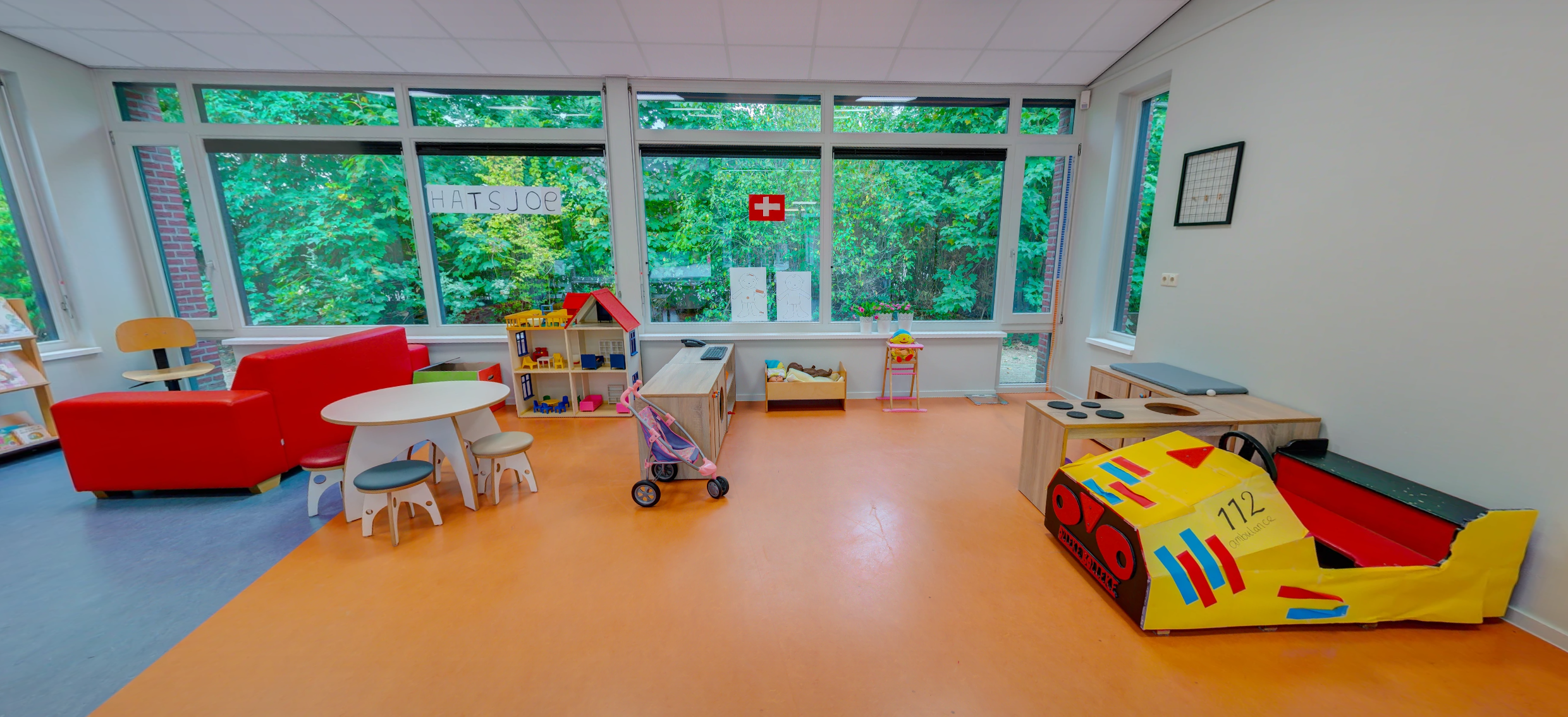 - Gezellige groepsruimte met verschillende speelhoeken. De peuter- en kleuterruimtes zijn van elkaar gescheiden door middel van een schuifdeur. Ze ontmoeten elkaar vaak; een goede voorbereiding voor de peuters op de basisschool.