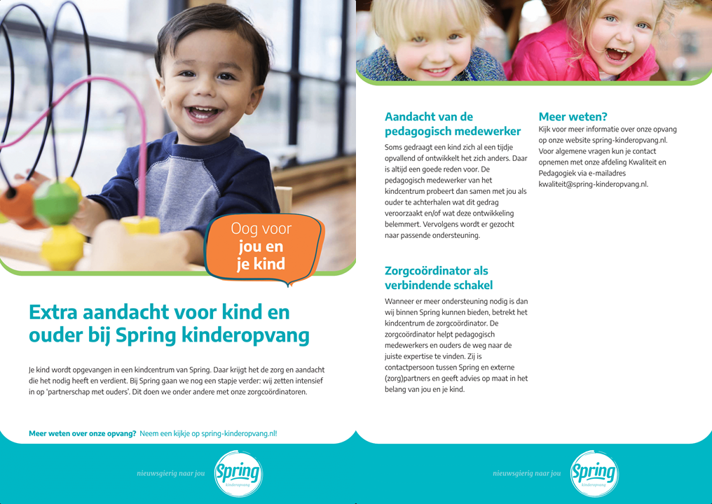 Dit doen we o.a. met onze zorgcoördinatoren. Zij zijn de verbindende schakel tussen Spring en externe (zorg)partners. Wanneer er meer ondersteuning nodig is dan wij binnen Spring kunnen bieden, helpt de zorgcoördinator ouders op weg. Je leest meer over de zorgcoördinatoren in onze flyer.